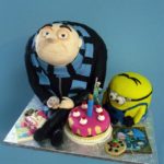 This Darling Despucable Me Cake was made by Kidacity. This Disney Cake features Gru, Margo, Agnes, Edith, Kyle, and Minions. These figures were skillfully handcrafted to look just like the characters in the movie..