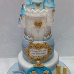 This fabulous Cinderella Cake was made by My Sweet Obsession. This cake features Cinderella and the Fairy Godmother. The hand sculpted and hand painted heart background looks wonderful. Notice the crown at the top and the blue birds flying around ‘Once Upon A Time.’ I really like the way the Fairy Godmother and Cinderella are 3-D. The pumpkin carriage cake in front has wheels that are brown vines. The birthday girl’s name is written in silver on the cake board beside the 3.