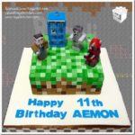 This Splendid Minecraft Cake was made by Blossom Dream Cakes. This Minecraft character is holding his pickaxe, ready to mine ore and other types of blocks. The Minecraft world is made up of many tiny blocks, just as this cake illustrates. The cake board is covered in small green blocks of varying shades of green to represent grass and other green vegetation. This edible Minecraft figure is covered in many small blocks that make up his head, face, arms, shirt, pants, and shoes, just like a character in the game.