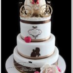 The bride and groom on the top of the cake are from Aliens. The top layer of the cake is themed from the movie Aliens. It is black with patterns carved into it and black rose looking pods surround it.