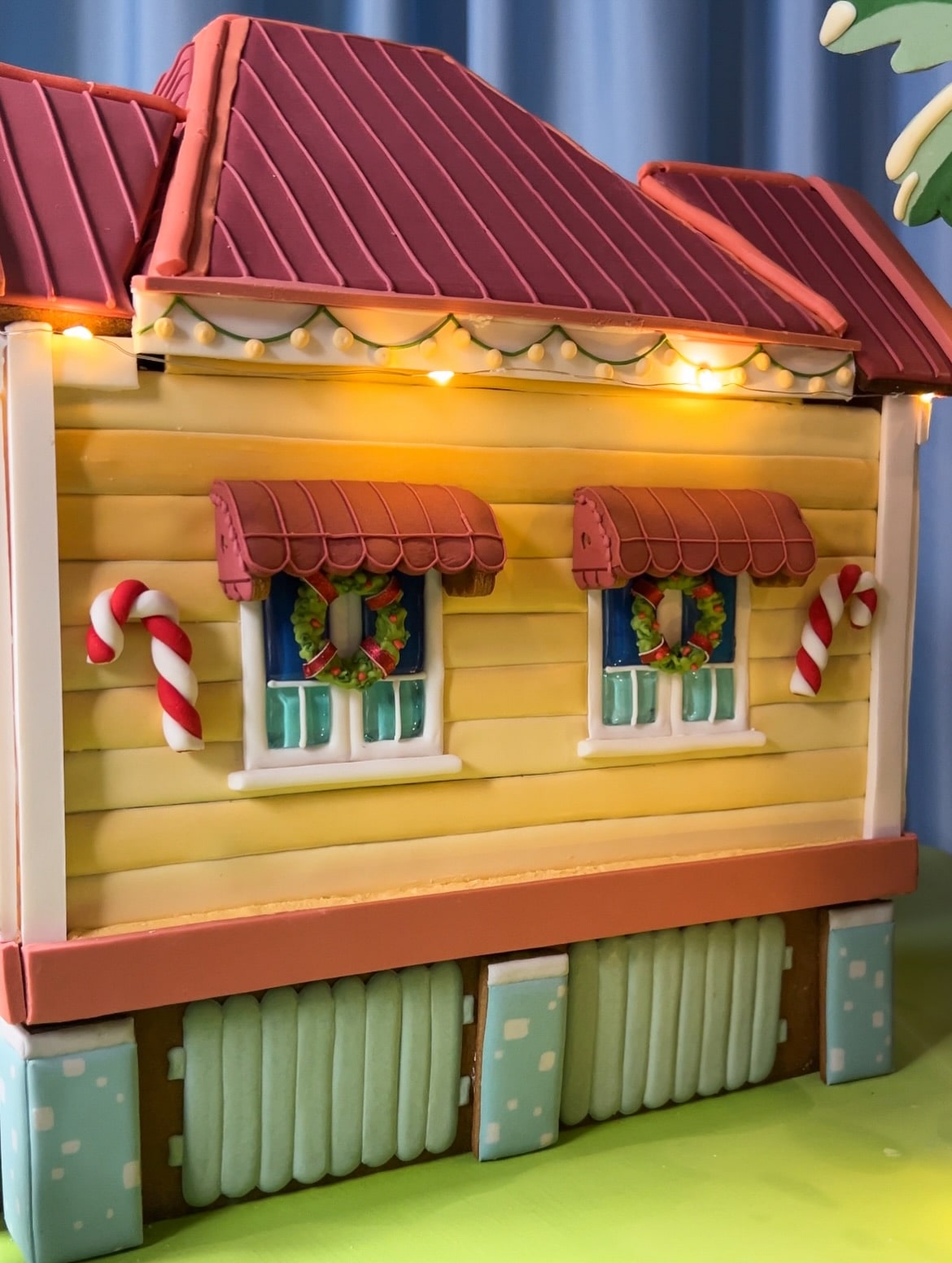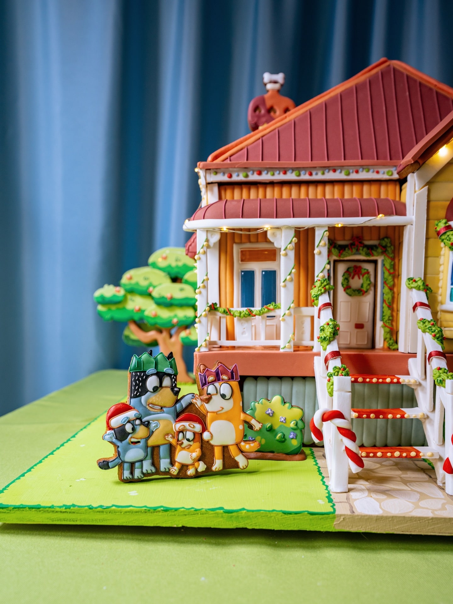 This amazing detailed Bluey Gingerbread House was made by Karen Thi. It shows the house decorated for Christmas. Bluey and his family are standing beside the house.