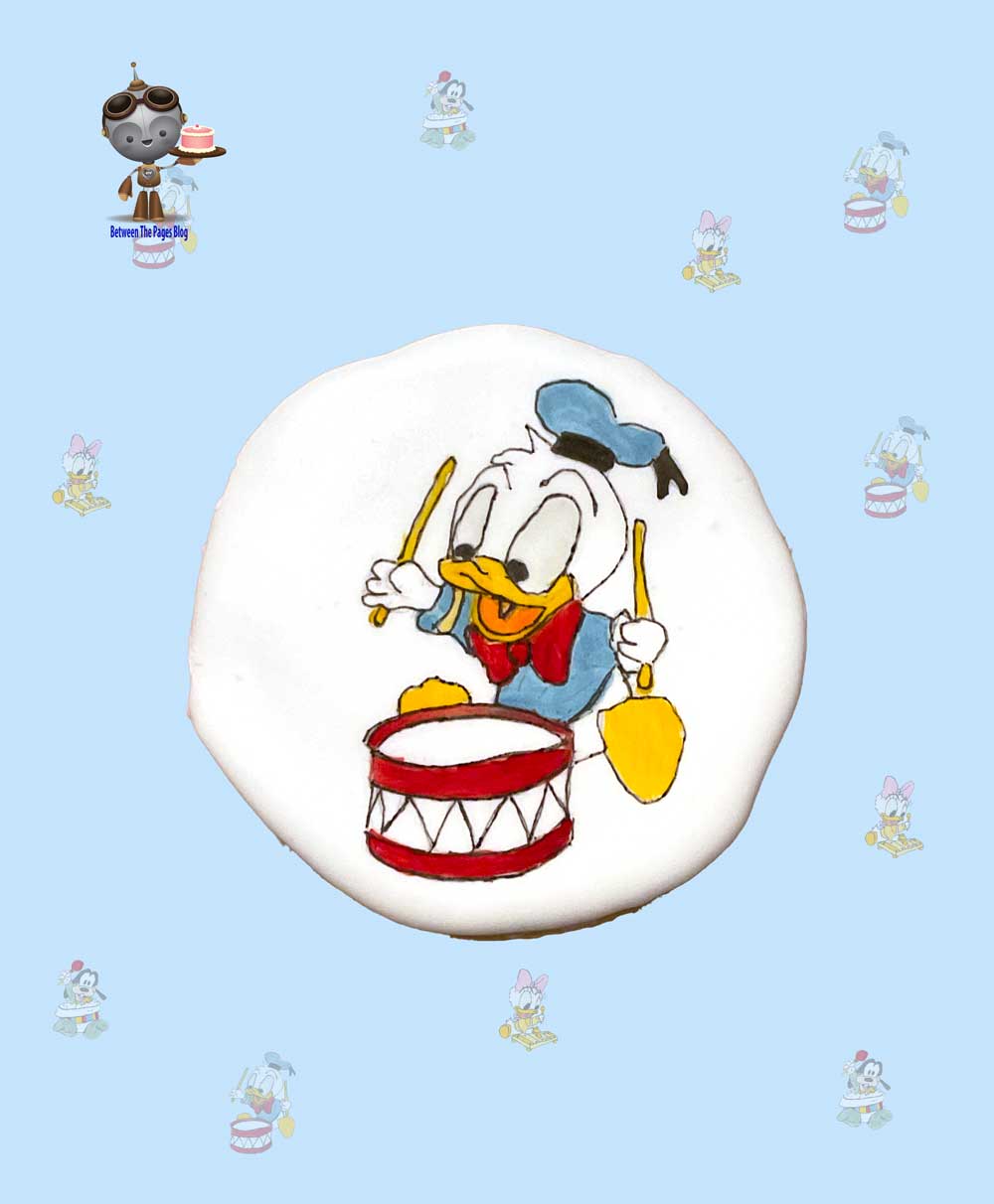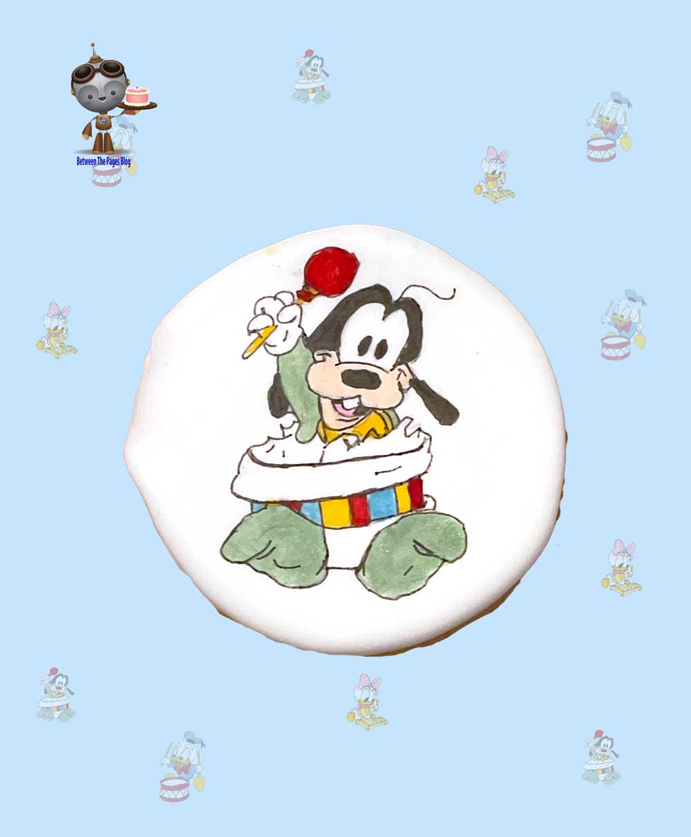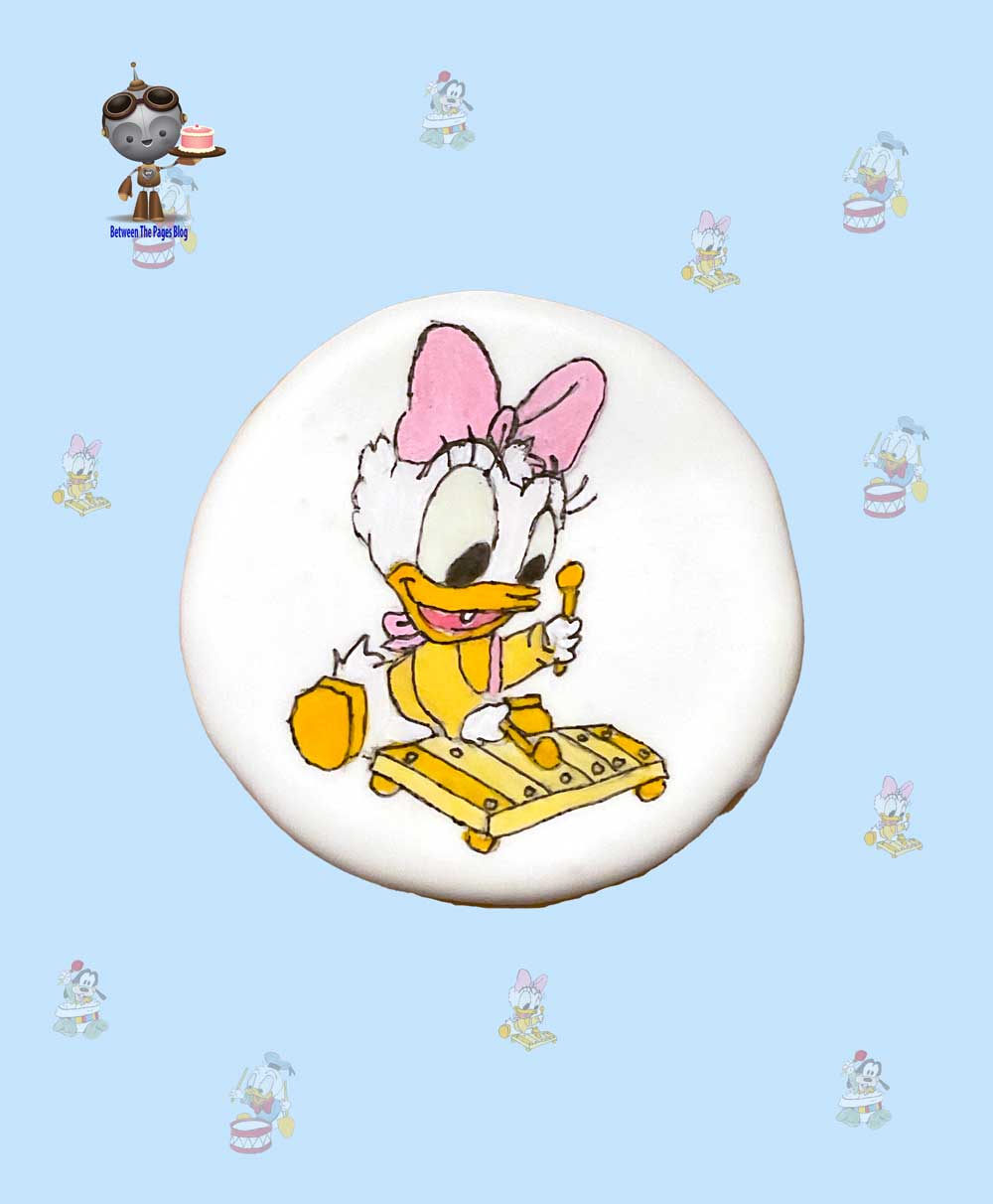 I made these Disney Baby Music Band cookies for a baby shower for couple who love music. The Baby Goofy cookie has him bursting through the drum he is playing, while the Baby Daisy cookie shows her playing the xylophone. The third cookie has Baby Donald playing the drum. I hand-pained each of the cookies. The images are based on images I found on the web.