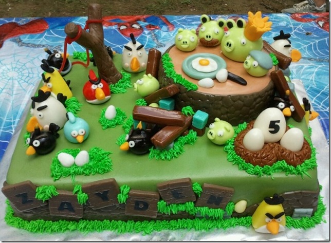 This awesome cake features Angry Birds teaming up with the Plants vs. Zombies and Green Pigs.