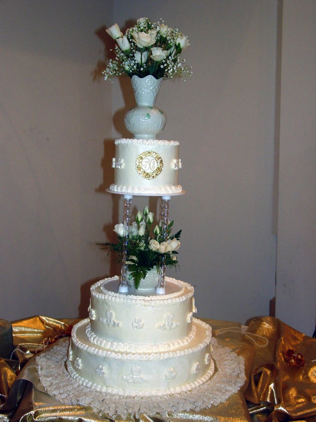 I made this 50th Wedding Anniversary Cake for my husband’s parents. This three tier cake is a pound cake covered in white buttercream frosting. There are white chocolate shamrocks and Claddagh symbols on the side of the cake. They are painted with luster dust. The cake has white roses in Irish china vases and the