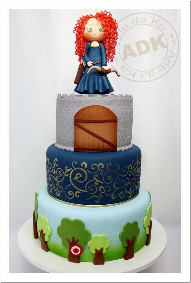 On many of the cakes, Merida is holding her bow in her hand and her long red curly hair is hanging down past her shoulders.