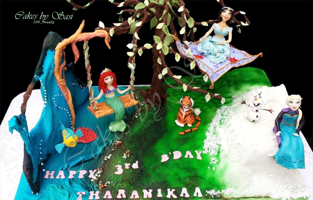This Disney Princess Cake features Ariel, Jasmine, Elsa the Snow Queen, Flounder, Rajah, and Olaf.