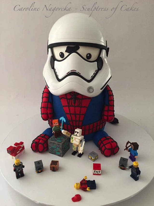 This marvelous Stormtrooper Spider-Man Costume cake features a white dog dressed in a Spider-man costume with a stormtrooper helmet. There are LEGO figures and other toys on the cake board in front of the cake. This wonderful cake was made by Caroline Nagorcka-Sculptress of Cakes. There is a red spider on the back of the costume. The […]
