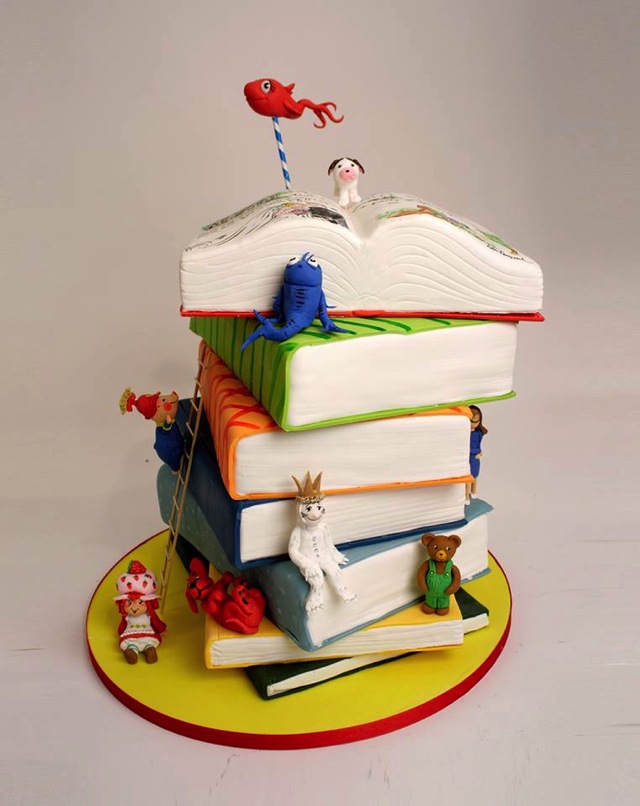 This storybook cake featues Strawberry Shortcake, Corduroy Bear, Red Fish, Blue Fish, Clifford, Max from Where the Wild Things Are,and Poky Little Puppy.