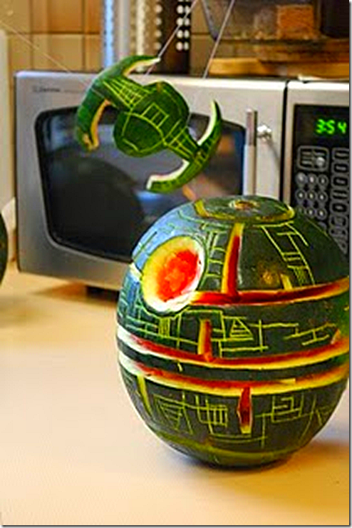 Who said carved fruit was only for Halloween? This wonderful Death Star Watermelon sculpture was made for a Star Wars themed birthday, not for a holiday tradition gone awry. This sculpture is ripe with creativity. Not many people think to do a Death Star in Watermelon form. Be sure to notice Darth Vader’s Tie