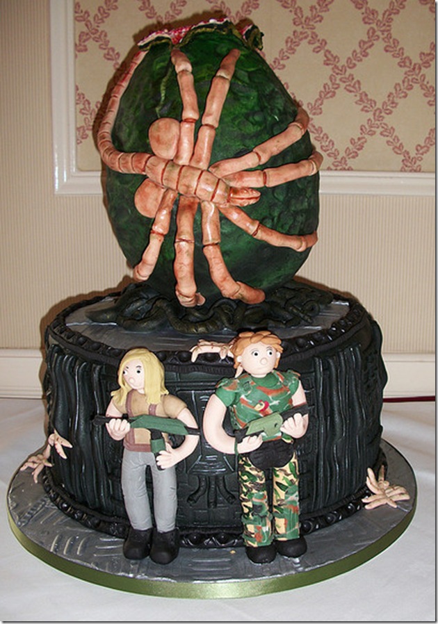 This is an amazing Alien cake featuring an alien egg and 2 characters from the movie.