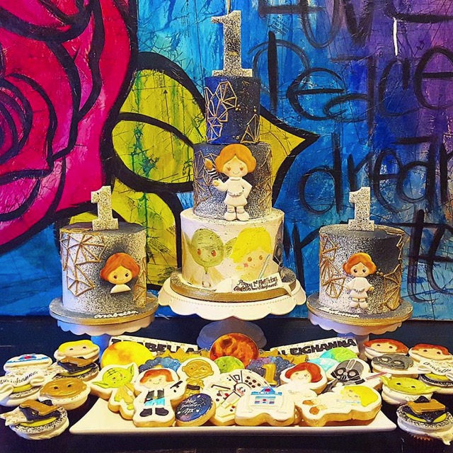This Fabulous Star Wars Birthday Cake and Cookies were made by The Painted Box. This Star Wars Party is enough to feed a whole lot of happy Star Wars fans. There is a three tier cake in the center that has Leia, Darth Vader, and Yoda painted onto the bottom layer. It has a figure of