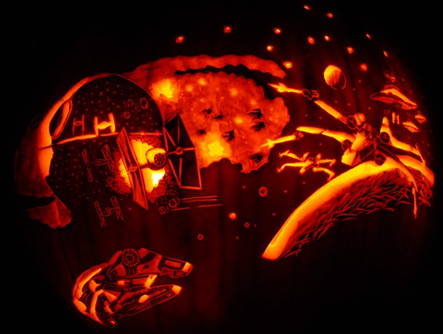 This amazing pumpkin carving features the Death Star, the Millennium Falcon, X-wings starfighters, TIE fighters, and Star Destroyers all on one pumpkin.
