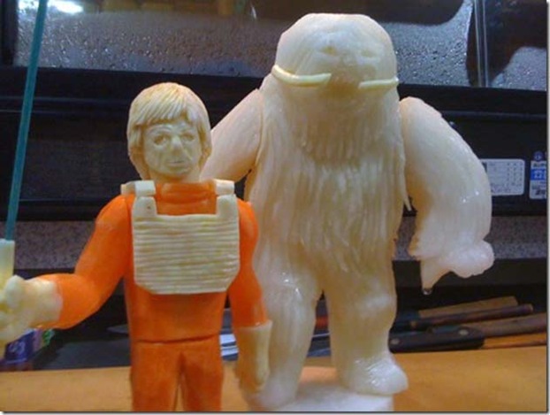 These cool Luke Skywalker and Wampa figures were handcarved from carrot, sweet potato, and a Japanese white radish.