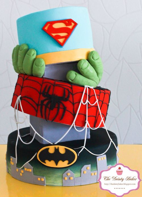 This Superb Superhero Mashup cake features Batman, Spider-Man, The Hulk, and Superman.