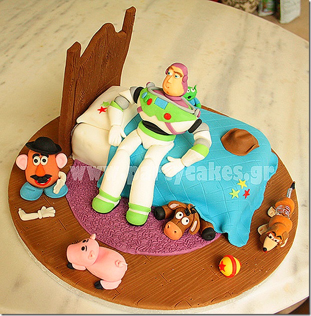 This sensational Toy Story Cake features Buzz, Bullseye, Mr. Potato Head, Hamm, Slinky Dog, and Little Green Man.
