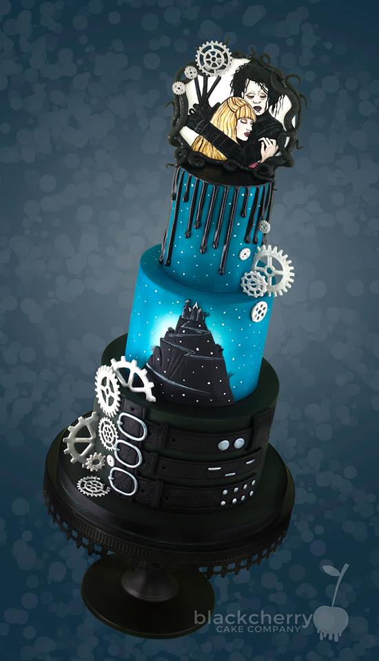 This marvelous Edward Scissorhands Wedding cake was made by Little Cherry Cake Company. This 3 tier cake has a drawing of Edward Scissorhands and Kim on top. At the top of the drawing frame are gears and black vines. The middle tier has a silhouette of the mansion on the hilltop. There are snowflakes all around. In […]