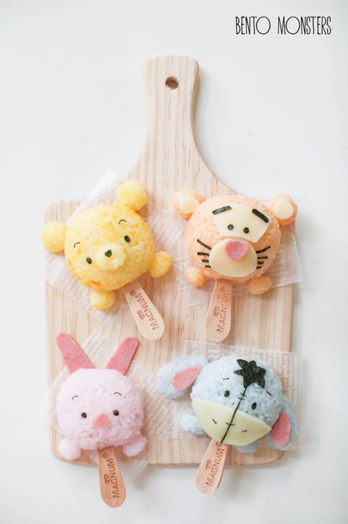 These adorable Winnie the Pooh and friends Rice Cream Balls feature Winnie the Pooh, Tigger, Piglet, and Eeyore. These wonderful rice cream balls were made by Bento Monsters. These rice balls have ice cream stick attached to look like rice-cream figures. These figures were made using colored rice. Here’s a version of the characters as
