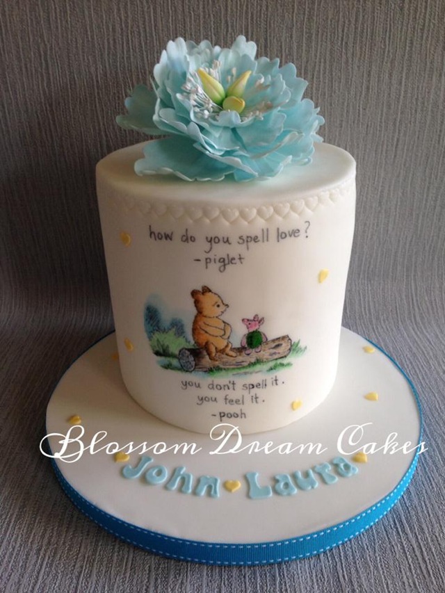 This lovely Hand Painted Winnie the Pooh Engagement Cake was made by Blossom Dream Cakes. I love the quote on this cake – “How do you spell love?” “You don’t spell it. You feel it.” Perfect for an engagement cake. Angela did an amazing job creating this open peony. Romantic Winnie