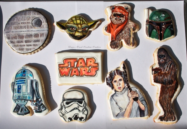 These Disney Star Wars Cookies feature Mickey Mouse dressed as Luke Skywalker, Minnie Mouse dressed as Princess Leia, Goofy as C-3PO, Stitch as Yoda, and Donald Duck as Darth Maul.